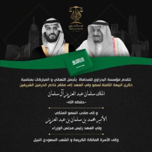 تتقدم مؤسسة البدراوي للمحاماة بأجمل التهاني والمباركات بمناسبة ذكرى البيعة الثامنة لسمو ولي العهد إلى مقام خادم الحرمين الشريفين الملك سلمان عبدالعزيز آل سلمان حفظه الله و إلى صاحب السمو الملكي الامير محمد بن سلمان بن عبدالعزيز ولي العهد رئيس مجلس الوزراء و إلى الأسرة المالكة الكريمة والشعب السعودي النبيل