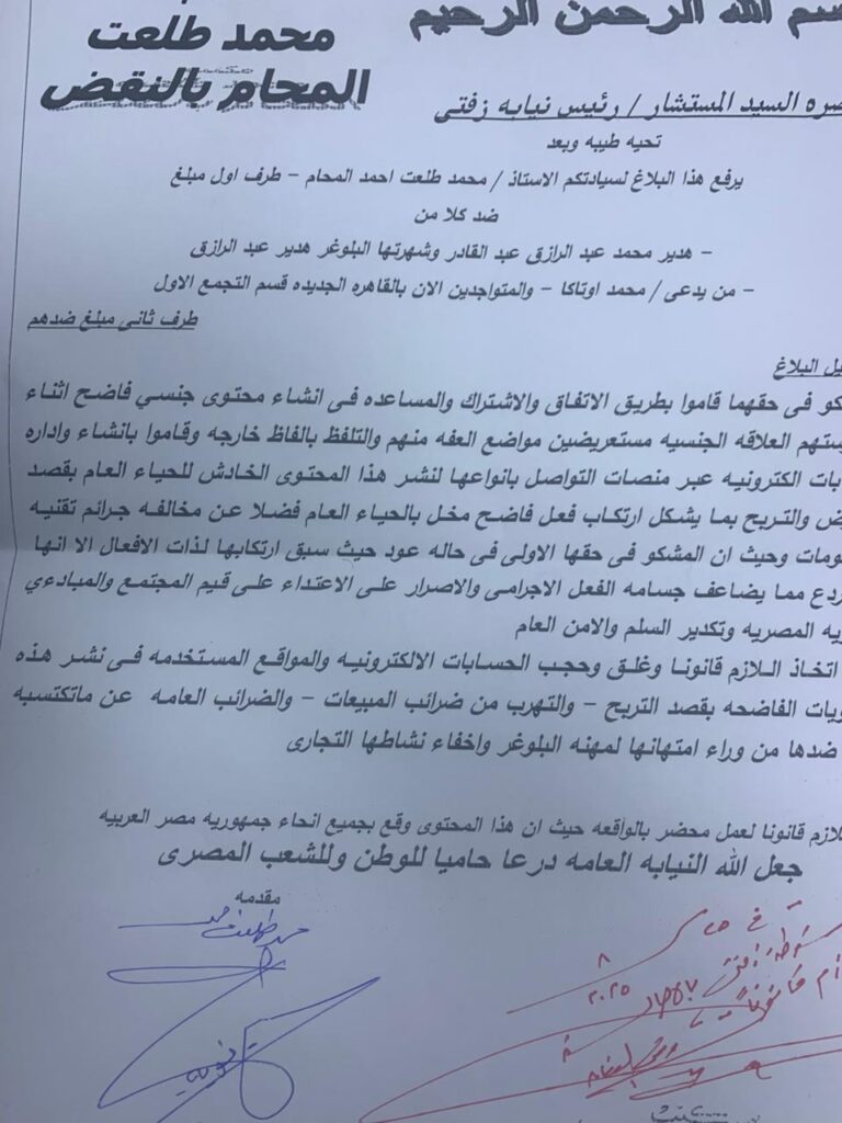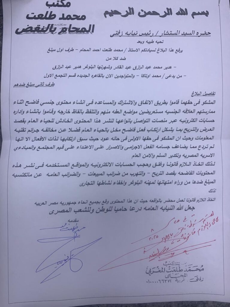بلاغ جديد يتهم البلوجر هدير عبد الرازق وأوتاكا بنشر الفسق والتهرب الضريبي وغسيل الأموال